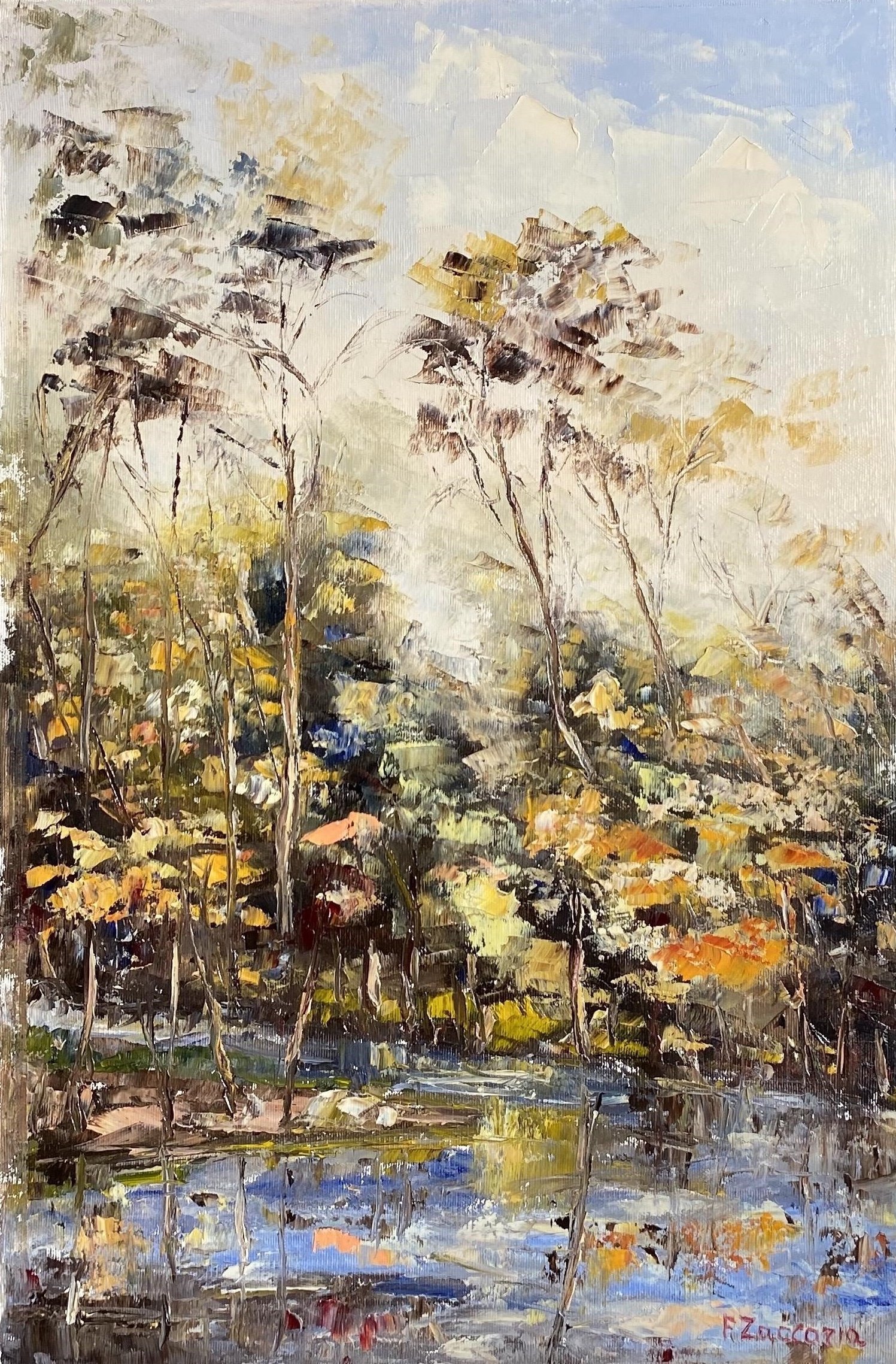 A mix of colors to represent a little piece of a lake surrounded by green. The spatula technique is used to make flowers, leafs and shades more realistic and with texture. Everything is reflecting on the lake.