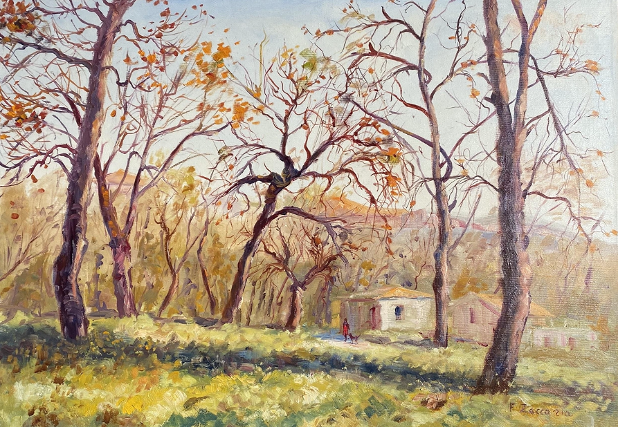 A landscape of a small house in Caserta, Italy, surrounded by a brownish forest. There’s a girl getting home after walking her dog. In the background is showing the rest of the town.