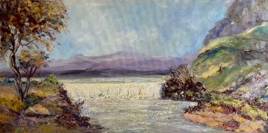 A landscape representing a little waterfall surrounded by mountains and trees.
