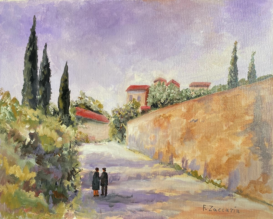 A glimpse of a small town in Abruzzo, Italy, a couple holding hands in a street. Everything is quiet, in harmony and express love. This scene is a representation of one of the many walks that the artist and his wife took in that small town. The painting is smooth and homogeneous.