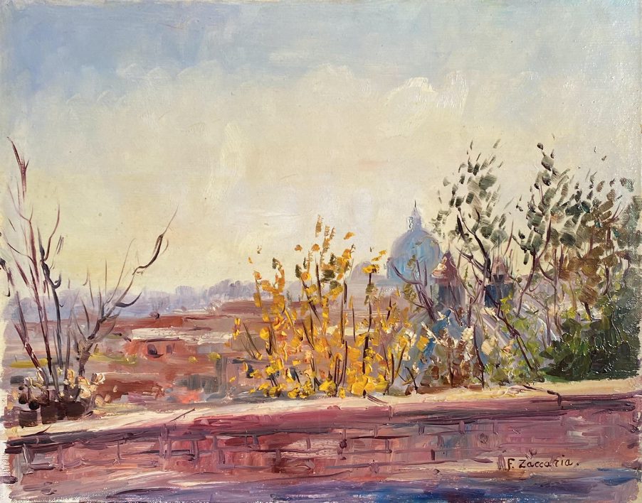 It’s a landscape in Rome in Pincio balcony up in Piazza del Popolo, where you can see the beautiful buildings. The artist puts in the foreground flowers and plants kinda like hiding the background where he painted the shades of some buildings including the St Peter’s “Cuppolone”. It’s an autumn atmosphere.