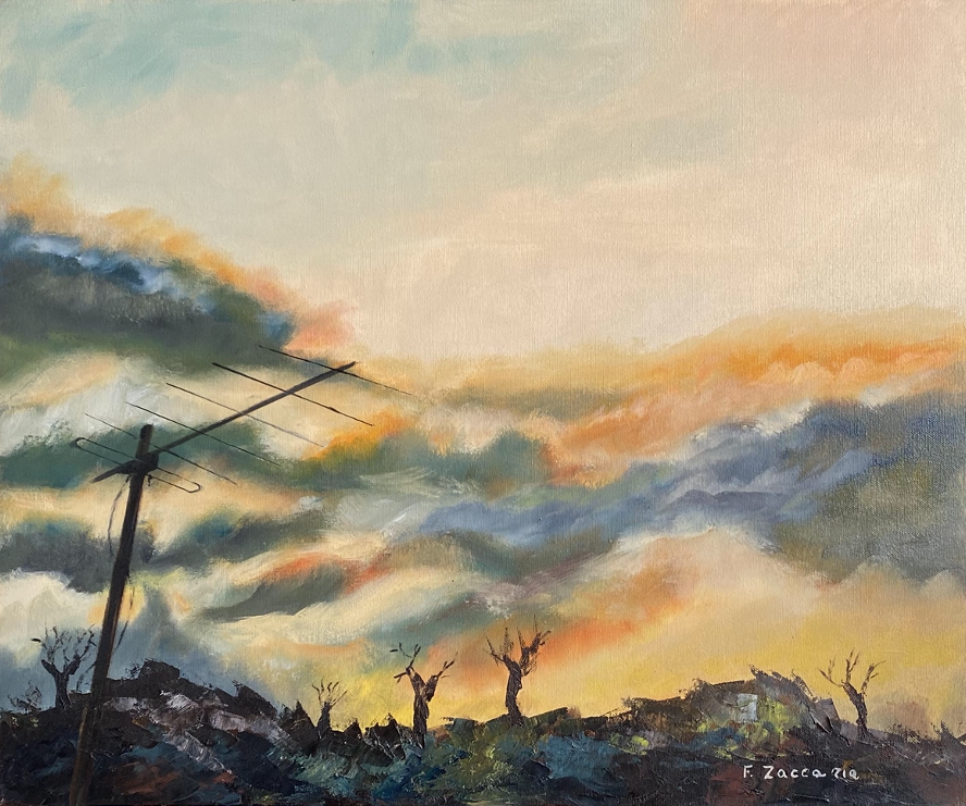 A scene where the artist painted an antenna that represent the progress of those years and put it in a contrast of cold and warm sensation and colors. The trees are dead, like after a fire, it is a mix of a sunny and cloudy weather.