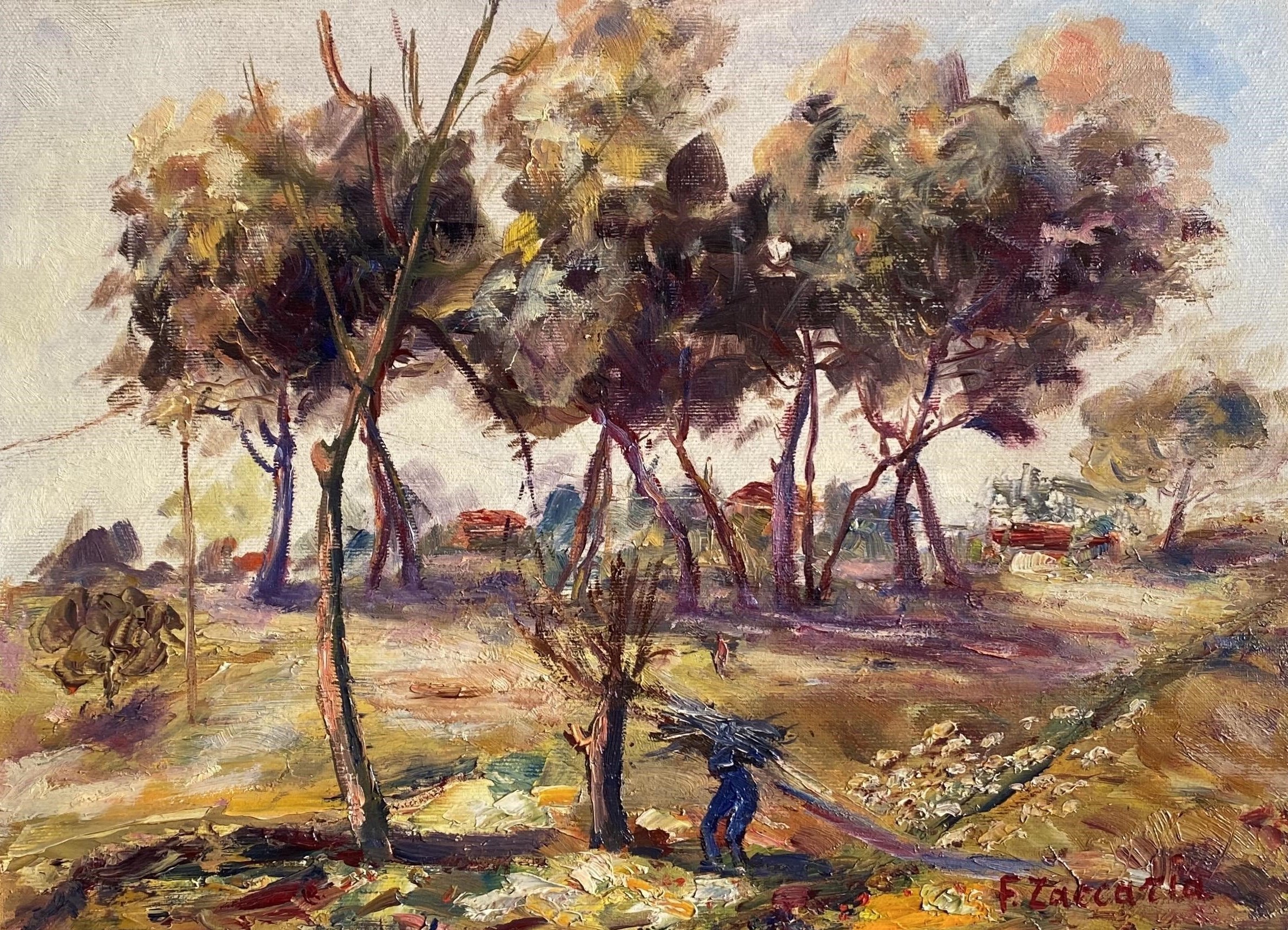 A very important street in Rome the painter is showing, but in the past, at the time (1980) it was a countryside where people worked. Bright colors on the ground to stand out the workers man and his classic spatula technique to give texture and dimension.