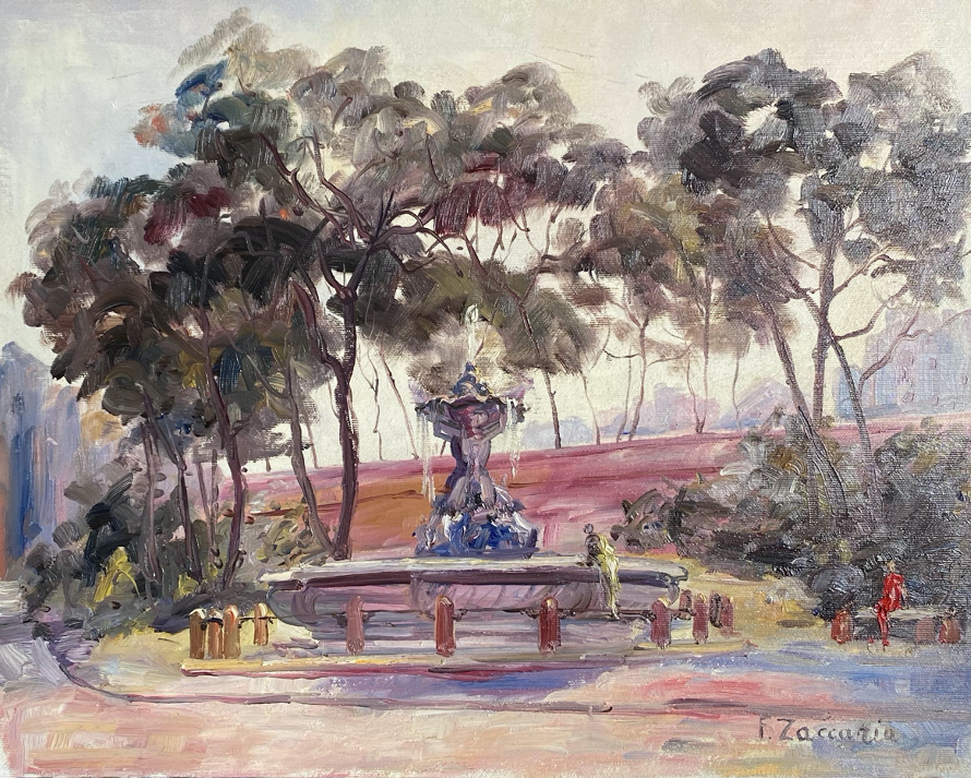 It’s a recreation of a square in Rome with a water fountain and a tourist looking into the water to find if there are any fish.